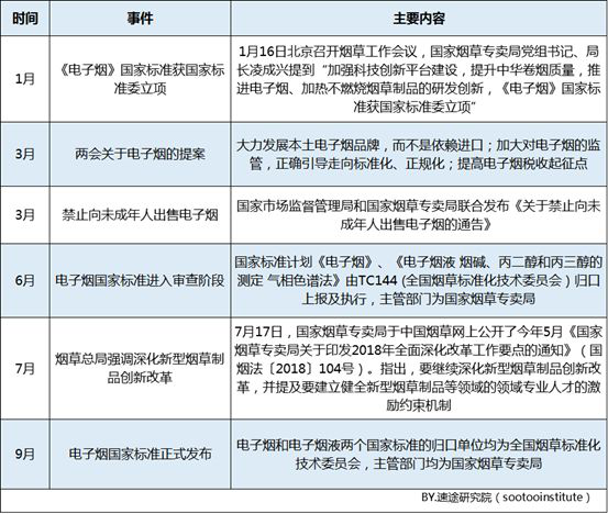 電子煙在市場上的推廣離不開政策監管,雖然目前還未納入監管范圍,不過有關部門早已開始了研究制定。在1月16日北京召開的煙草工作會議,就已經提到要推進電子煙、加熱不燃燒煙草制品的研發創新,電子煙國家標準獲國家標準委立項。在3月份兩會上,有代表提議加大對電子煙監管,提高個稅起征點等問題。國家市場監督管理局和煙草專賣局隨后也聯合發布了《關于禁止向未成年人出售電子煙的公告》。在9月,電子煙國家標準正式發布,規定電子煙和煙液的標準歸口單位為全國煙草標準技術委員會,主管部門為國家煙草專賣局。
