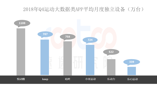 在2018年Q4運動大數據類APP平均月度獨立設備的統計中,悅動圈達到了1188萬臺,排在運動APP中首位。Keep以787萬臺排在第二位,咕咚與keep非常接近達到了758。