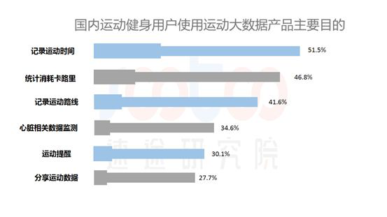 在國內運動健身用戶使用運動大數據產品主要目的調研中,半數左右的健身人群選擇了記錄運動時間。運動時間是運動過程中最基本的數據,是最多人使用的功能。有46.8%的用戶用于統計消耗卡路里,熱量消耗是用戶對運動水平更進一步的要求,能夠知道運動消耗的卡路里,以便更合適的安排運動量。記錄運動路線是如今非常受歡迎的功能,能夠以圖片的形式生成運動痕跡,非常適合分享在社交媒體平臺。