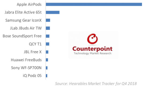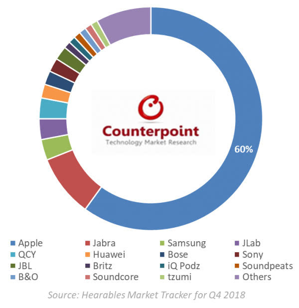 就品牌而言,蘋果顯然是市場領先者,擁有60%的市場份額。然而,由于客戶等待定于2019年第一季度推出的新款AirPods,該公司所占份額有所下降。JLab和QCY等二線品牌的強勁表現也對蘋果的市場份額產生了負面影響。