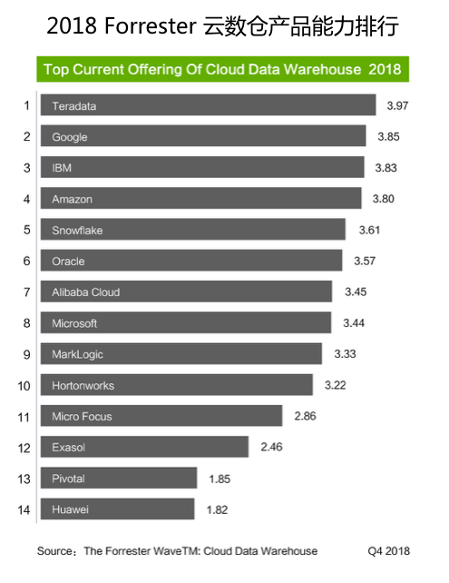記錄被不斷刷新,并且得到了權威機構的認可:在Forrester發(fā)布的《The Forrester WaveTM: CloudDataWarehouse, Q4 2018》中,阿里云MaxCompute、DataWorks、ADB等三款產(chǎn)品成功入選,并在產(chǎn)品功能(Current Offering)方面力壓微軟。