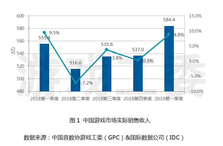 昨日,中國音數協游戲工委發布由《中國游戲產業報告》編撰工作組撰寫的2019年第一季度中國游戲產業報告。報告顯示,2019年一季度,中國游戲市場整體呈現回升的態勢,實際銷售收入達到584.4億元,相比2018年第四季度增長47.4億元,同比增長5.1%,環比增長8.8%。市場結構趨于穩定,用戶規模繼續擴大,已突破6.4億人,同比增長6.7%,仍有一定上升空間。中國自主研發游戲繼續保持收入領先地位,占領超七成市場。