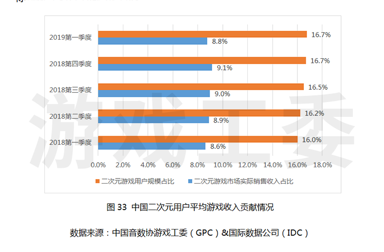 2018第一季度至2019第一季度期間,中國二次元游戲用戶規模占比16.7%,貢獻了8.8%的整體游戲收入,二次元游戲用戶的平均游戲產品消費能力仍有較大的提升空間。