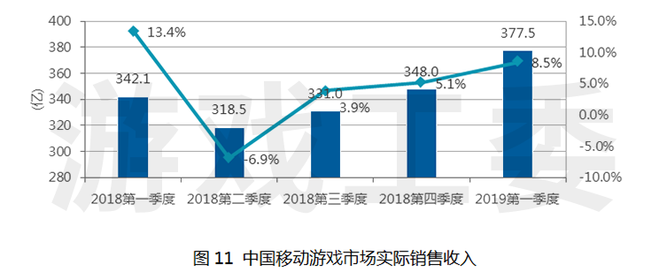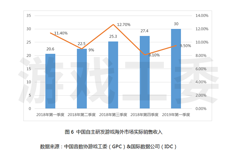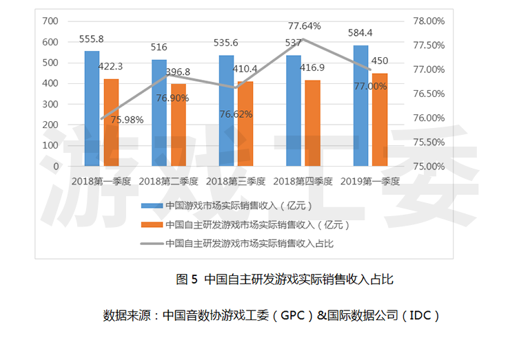 報告顯示,中國自主研發游戲實際銷售收入占比呈波動上升趨勢,從2018第一季度的76.0%上漲到今年第一季度的77.0%,相比2018年第四季度占比有所下降,但依舊保持市場收入的主導地位。