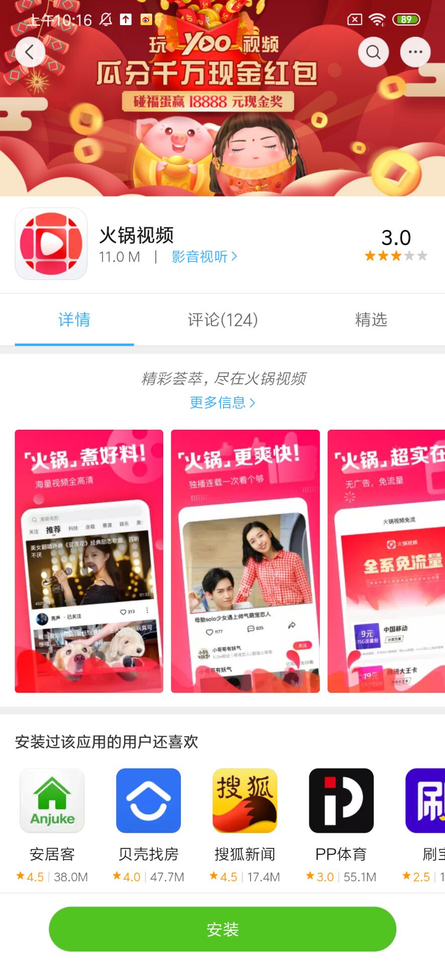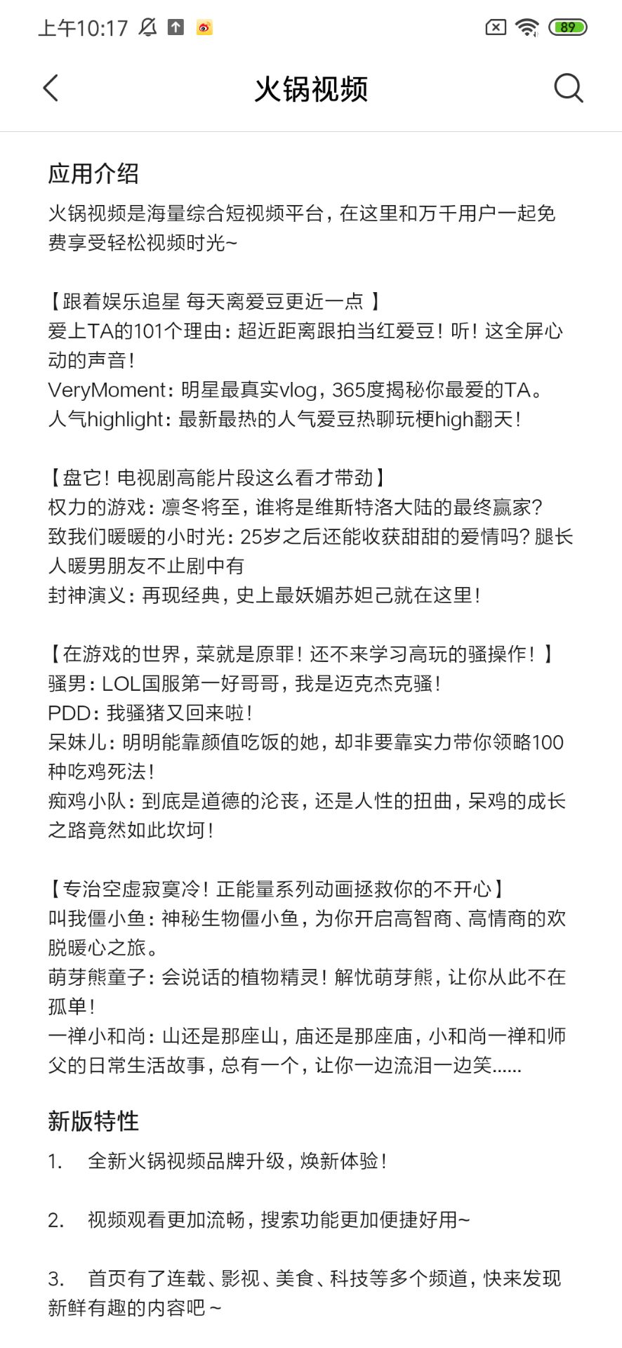 點(diǎn)進(jìn)火鍋視頻的詳細(xì)信息,頁面上方依然存在yoo視頻的字樣,但應(yīng)用介紹卻與yoo視頻完全不同。介紹顯示,火鍋視頻定位于海量綜合短視頻平臺,支持追星、電視劇、游戲、動畫等海量內(nèi)容。