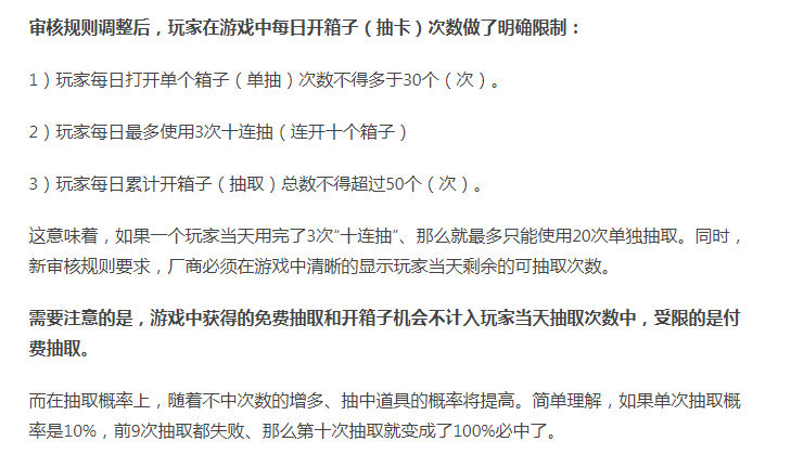 據(jù)國(guó)內(nèi)媒體Gamelook報(bào)道,某游戲發(fā)行公司高管在其博客文章中曝光了主管部門對(duì)于游戲開(kāi)箱、抽卡部分限制規(guī)定的改變,包括玩家抽卡數(shù)量每日不得超過(guò)50次、中獎(jiǎng)幾率修改等,其原因可能旨在解決近年來(lái)日益頻繁的未成年人游戲充值糾紛。而手游領(lǐng)域受這一調(diào)整影響最大的可能要數(shù)二次元游戲。