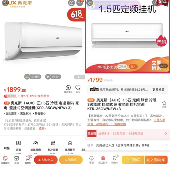 以市面熱銷的空調為例,同樣一款奧克斯1.5匹定頻掛機,京東售價1899元,蘇寧價為1799元;而一款奧克斯大1匹一級能效變頻空調,京東標價3099元,蘇寧價卻打到了2799元,比京東整整低了300元……為什么同樣型號的奧克斯空調,在蘇寧平臺的價格卻更低呢?