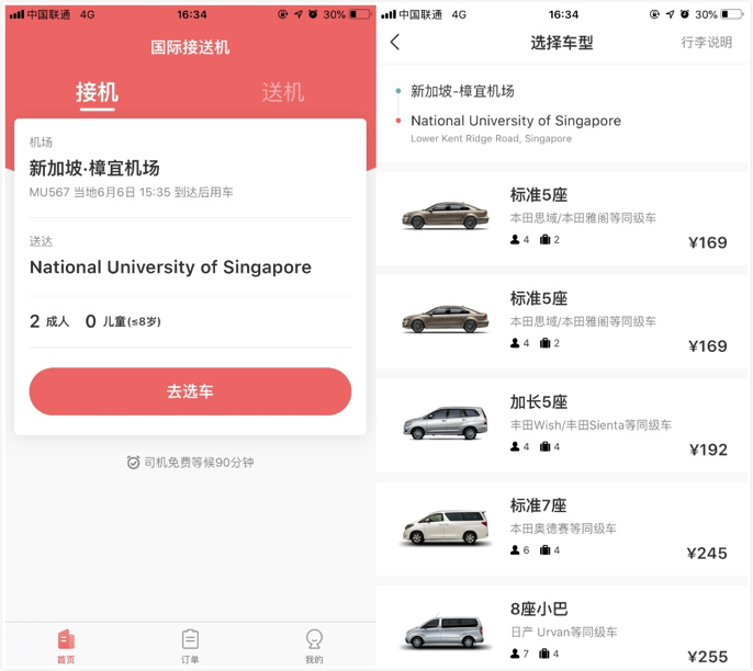 留學生群體在預訂機票后可以通過異鄉接機APP選擇航班號、航班時間、接送地址預訂攜程境外專車接送機服務。接送機服務已覆蓋380多個國際機場,可提供多種車型服務,為留學生提供多樣化選擇。