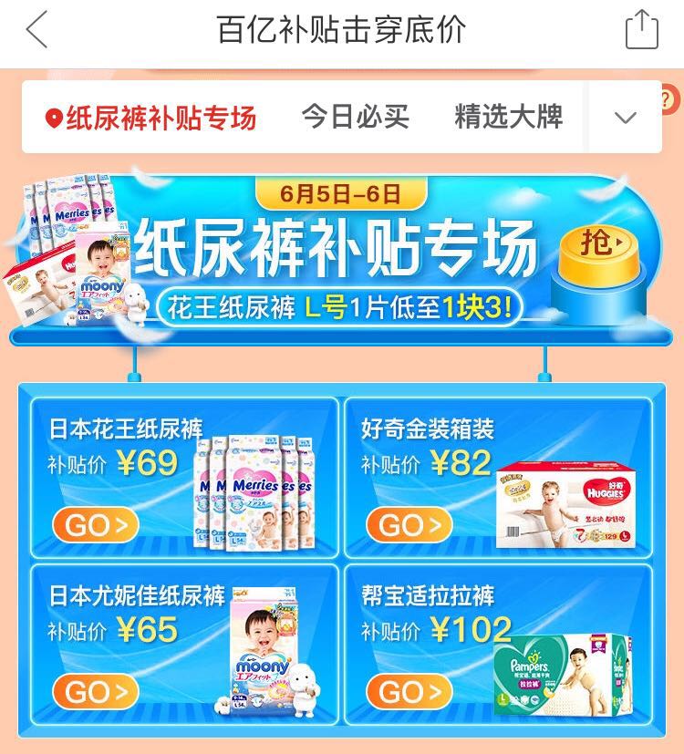 ▲拼多多“百億補(bǔ)貼”開設(shè)紙尿褲等母嬰產(chǎn)品專場