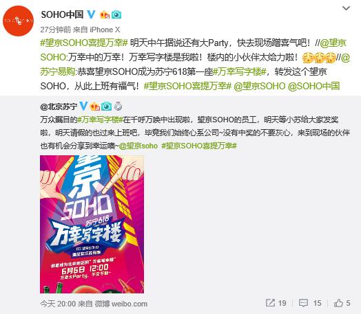 6月5日晚8點北京蘇寧官方公布,北京地區“萬幸寫字樓”名單揭曉,望京SOHO寫字樓脫穎而出,喜提蘇寧易購 “萬幸大禮包”。SOHO官方第一時間也做出了回應。望京SOHO是從首都機場進入市區的第一個引人注目的高層地標建筑,被稱為“首都第一印象建筑”,“網絡紅人”潘石屹正是SOHO中國的董事長。