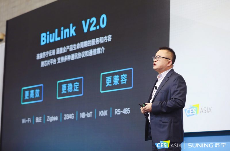 Biu+技術方面, BiuOS產品智能化全棧解決方案包含了“云,管,屏,芯”四個層面的內容。本次大會中重點提到的“管”代表了作為連接蘇寧云端和智能設備的管道的BiuLink 2.0,支持更多通訊協議和通信媒介,并覆蓋了WiFi、藍牙、Zigbee等多種終端通信模塊,提供更高效、更穩定、更兼容的連接能力。