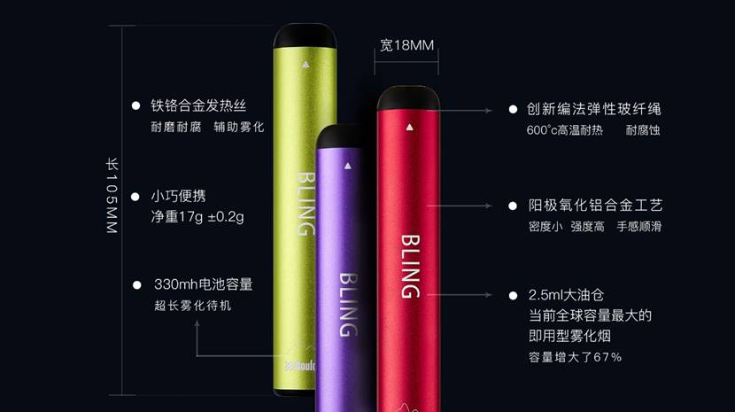 據介紹,全新Bling選擇了330毫安的電池+2.5ml煙油的配置,售價為49元/支,表現出了極高的性價比。