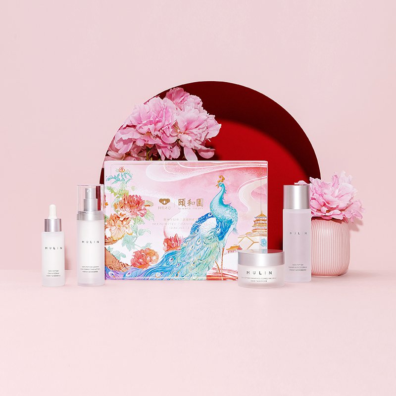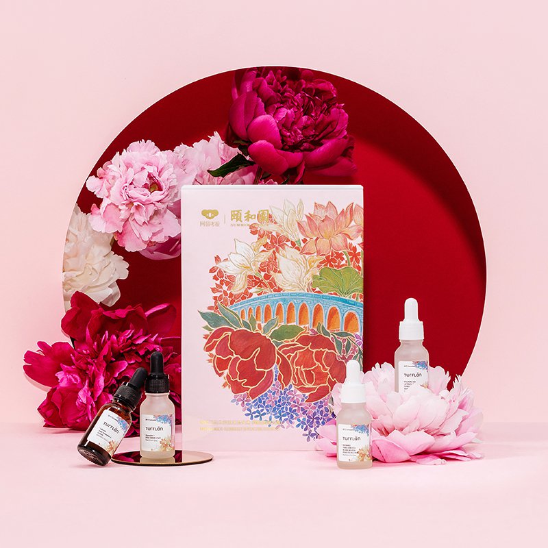 牡丹,有國色天香、花中之王的美譽,“云想衣裳花想容”中的“花”亦指“牡丹花”。因此“頤和花容系列”的設計非常重視牡丹花元素:魚子醬水乳精華禮盒采用了“鳳穿牡丹”的宮廷紋飾;原液禮盒則使用了頤和園中“金橋百花”的景色。中國傳統紋飾圖案“圖必有意,意必吉祥”,“頤和花容系列”禮盒以牡丹花為飾,也為人們的愛美之心增添了美好寓意。