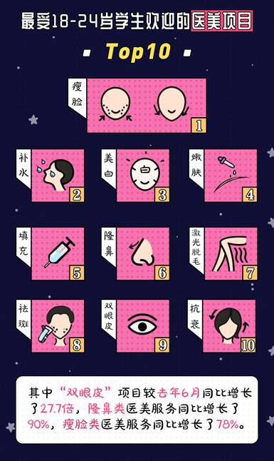 跟工作一族相比,學生族選擇的整形消費更輕巧,偏重于“輕醫美”類型,從天貓和阿里健康聯合推出的《2019暑期醫美數據》看,最受學生們歡迎的項目中,排在前三的包括了瘦臉、補水、美白。不過,隨著人們對于醫美的開放度日益提高,填充、隆鼻、祛斑和開雙眼皮也越來越受到關注,其中,開雙眼皮的人數同比增長翻了整整27倍。