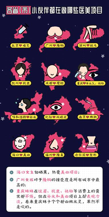 沈陽人愛開雙眼皮、福州人愛隆鼻、重慶愛半永久…不同城市人們對整形項目的青睞,大致可以看出文化和地域引發的審美差異。例如,炎熱的海口時時都有被曬傷的危機,人們對美白類醫美的追求在各個城市中占比最高;而廣州對于隆胸的接受度是所有城市中最高的;有意思的是,重慶人在半永久、抗衰、祛斑等消費上的需求都不低,但在補水和美白項目上卻表現冷淡,看來重慶妹子個個都白嫩水靈,果然不是吹的。