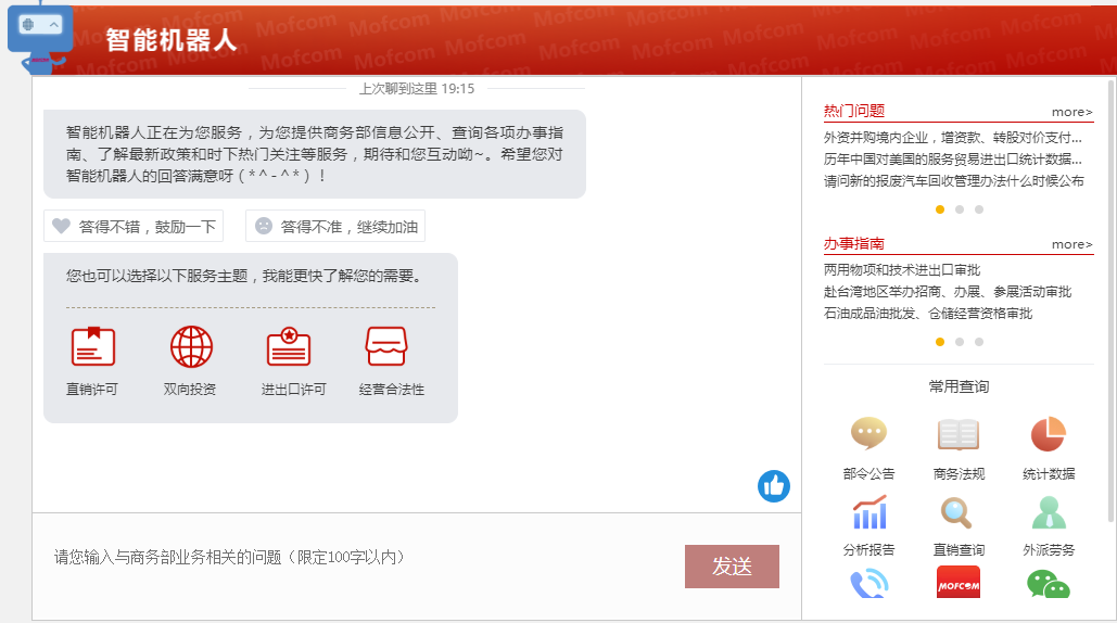 商務部網站是商務部進行公眾服務的窗口之一,為公眾提供政務公開、政務服務與公共服務等服務。目前,該智能問答機器人已正式在商務部官網首頁上線,可提供商務部公開信息、查詢辦事指南、了解最新政策和熱門問題等技能,能為公眾提供24小時不間斷的即時服務。今天,除了電話、郵件、網站留言之外,公眾又多了一種更直接的方式來快速便捷的找到所需。