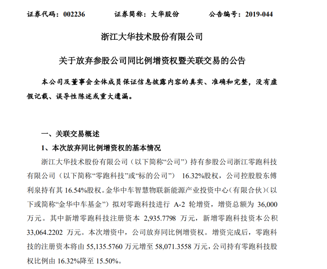 速途網(wǎng)訊 今日,浙江大華技術(shù)股份有限公司發(fā)布公告,金華中車基金智慧物聯(lián)新能源產(chǎn)業(yè)投資中心(有限合伙)對零跑汽車進(jìn)行3.6億元A-2輪融資。其中,2935.78萬元計入零跑科技注冊資本,其余3.3億元計入零跑汽車的資本公積。