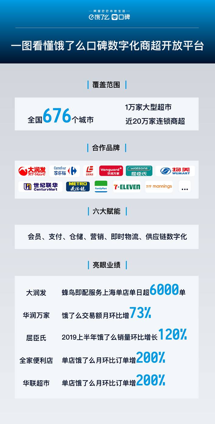 速途網8月12日消息(報道:李楠)日前,餓了么口碑宣布建立數字化商超開放平臺,從訂單、配送、倉儲等環節統一輸出數字化成長能力。目前在全國676個城市,有超過1萬家大型超市以及總數近20萬家的連鎖商超入駐開放平臺。截至2019年8月,餓了么口碑已與大潤發、家樂福、百聯、華潤、物美等達成深度合作。商超正成為繼餐飲之后的又一大本地生活消費場景。