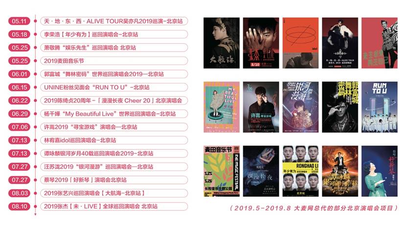 值得一提的是在演唱會這一品類上,大麥網始終保持著強勁的領先優勢,2019年總代的項目既包括吳亦凡、張藝興、UNINE等新生代領軍藝人及團隊的首次巡演,也包括周杰倫、華晨宇、五月天、張杰等流行音樂實力唱將的全國巡演,同時還覆蓋了麥田音樂節、EDC音樂節、草莓音樂節等知名音樂節項目。以北京為例,今年5-8月北京區域內核心頭部演唱會不到20場,大麥網總代16場。