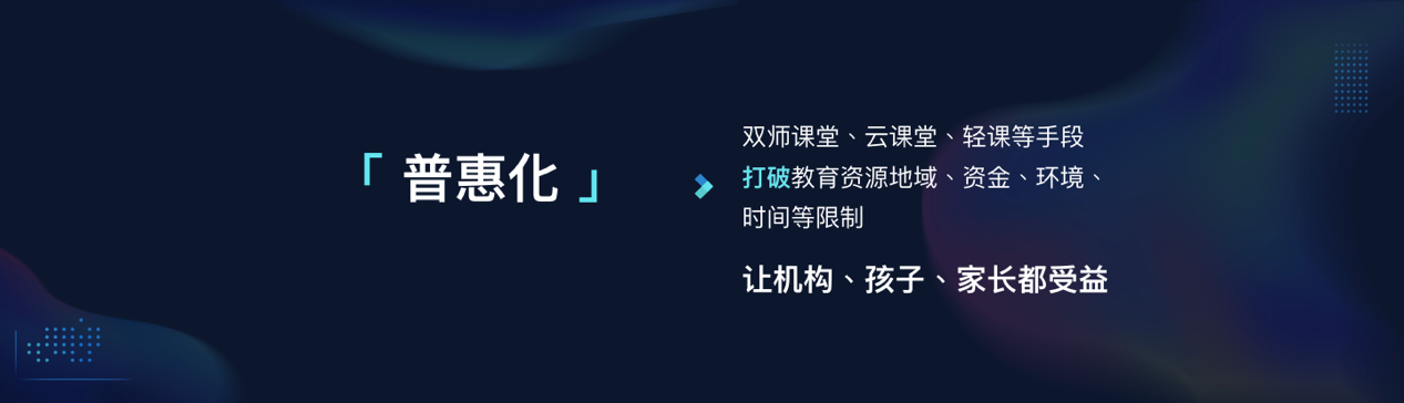 數(shù)智化:各類(lèi)教育科技產(chǎn)品將覆蓋教學(xué)評(píng)估、教務(wù)管理、家校共育等各個(gè)環(huán)節(jié),從學(xué)習(xí)畫(huà)像到成長(zhǎng)過(guò)程,一切業(yè)務(wù)數(shù)據(jù)化,幫助家長(zhǎng)提升可查價(jià)值,家校共育再無(wú)障礙。同時(shí)教務(wù)教學(xué)各環(huán)節(jié)效率、家校互動(dòng)共育體驗(yàn)都得以提升、從而開(kāi)創(chuàng)更多新業(yè)務(wù)場(chǎng)景。