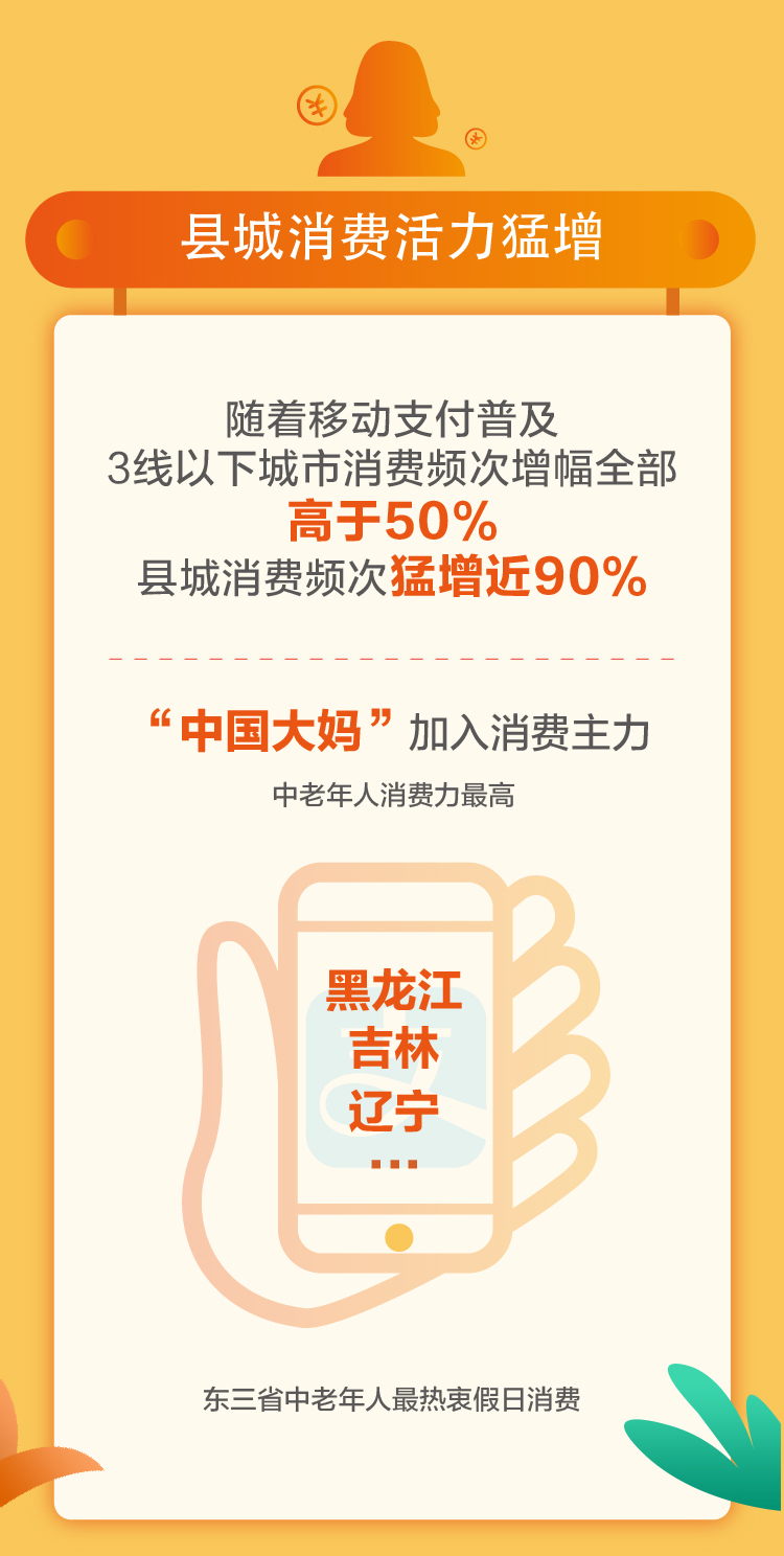 隨著移動支付的不斷普及,縣城的消費活力令人眼前一亮。十一黃金周,3線以下城市消費頻次增幅全部高于50%,縣城消費頻次更是猛增近90%。