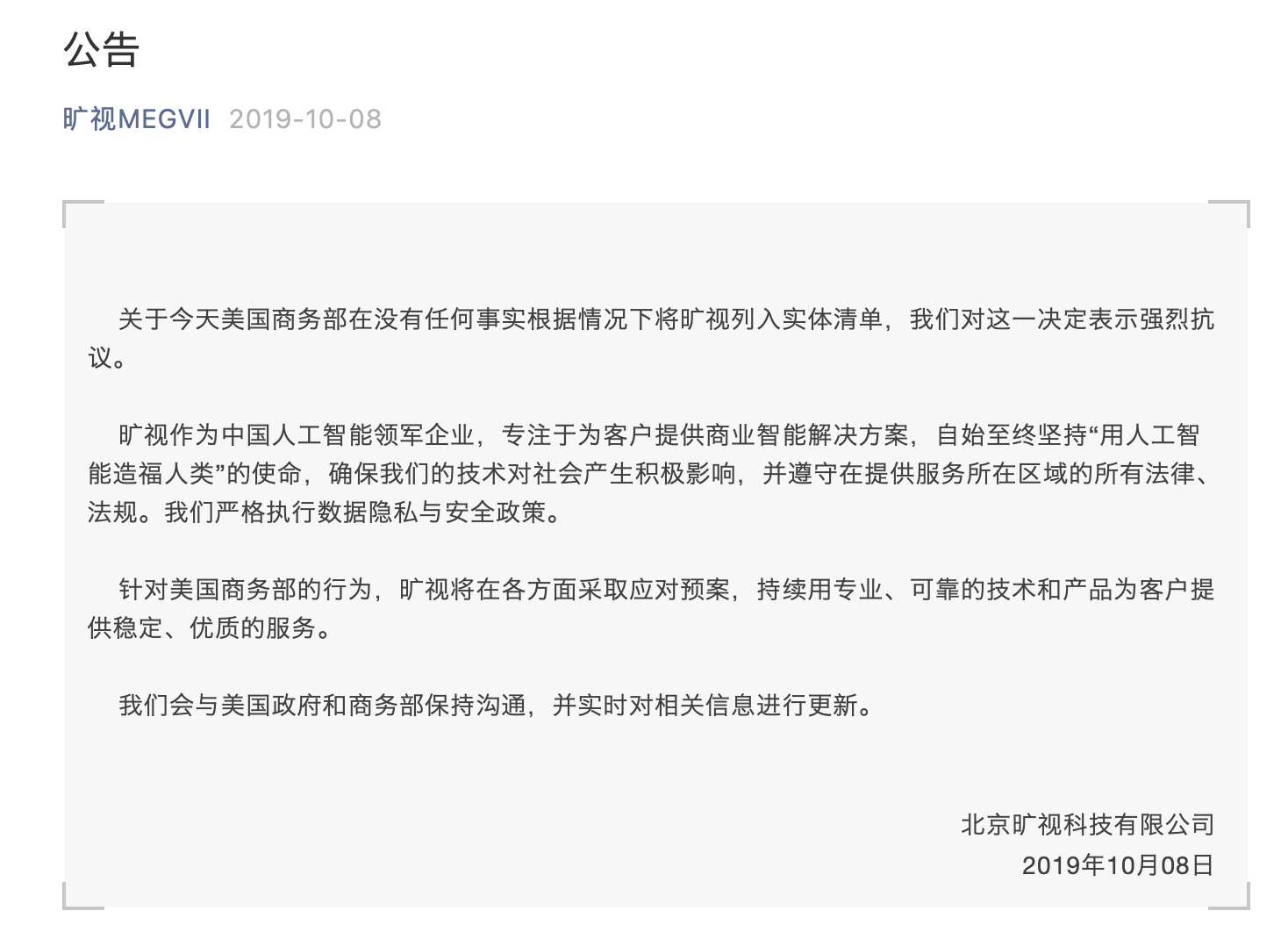 速途網10月8日消息(報道:喬志斌)今日,國內人工智能企業曠視科技對美國商務部將曠視列入實體清單發表回應。曠視在回應中表示對這一決定表示強烈抗議,同時表示曠視將在各方面采取應對預案,持續用專業、可靠的技術和產品為客戶提供穩定、優質的服務。