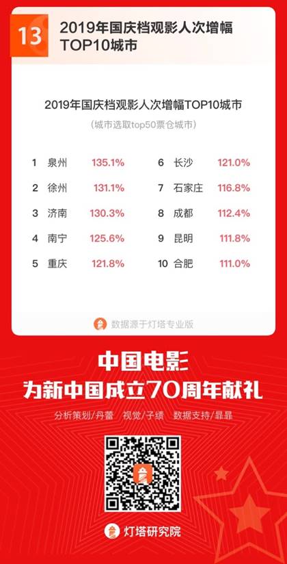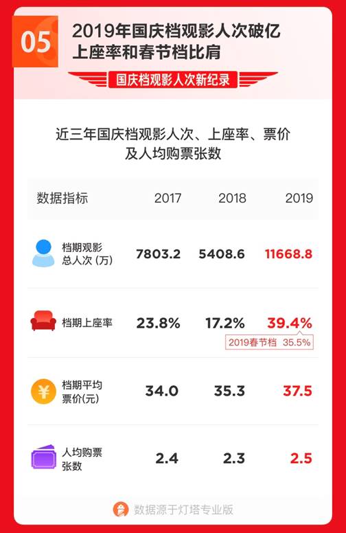 2019國慶檔的首日票房即達(dá)7.96億元,創(chuàng)下春節(jié)檔后最高單日票房紀(jì)錄,7天票房的日均值是去年兩倍。今年國慶檔累計(jì)觀影人次超過1.16億次,不僅創(chuàng)下國慶檔歷史新高,還超越了2017年及此前歷年春節(jié)檔的總?cè)舜?。上座率超過今年春節(jié)檔的35.5%,達(dá)到39.4%。不僅如此,三部主旋律大片口碑和票房的雙雙走高,使得今年打破以往國慶檔一片獨(dú)大的格局,接近貢獻(xiàn)兩部票房20億+的電影。