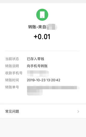作為收款方,則會(huì)收到一條來自微信支付的賬單提示,顯示有來自某微信用戶的向手機(jī)號(hào)轉(zhuǎn)賬,并已存入零錢。