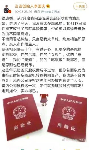 李國慶在微博發(fā)布長文回應俞渝,稱7月底便遞交起訴狀和俞渝離婚,但俞渝以感情未破裂為由不同意。并告誡俞渝不要拖延時間轉(zhuǎn)移財產(chǎn),將撕破臉對抗到底。