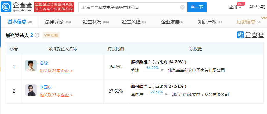 而從企查查相關(guān)信息來看,當(dāng)當(dāng)網(wǎng)所屬公司北京當(dāng)當(dāng)科文電子商務(wù)有限公司最終受益人一個(gè)為俞渝,另一個(gè)則為李國慶。