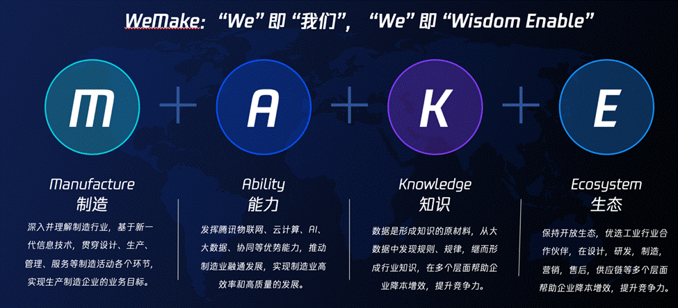 WeMake是騰訊云深入并理解制造行業,基于新一代信息技術,發揮騰訊物聯網、云計算、AI、大數據、協同等優勢能力重磅打造。與此同時,WeMake以“制造”為底,融合了能力、知識、生態三大維度,構建了四位一體的制造業數字化升級方案。