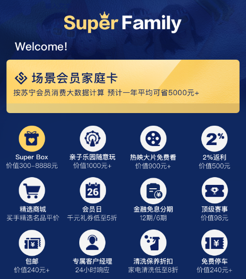“在設計這款會員產品時,我們就希望能觸達每一位家庭成員。”蘇寧相關負責人解釋說:“比如媽媽,她用的更多的可能是購物,那么家庭會員有購物2%的返利;爸爸可能喜歡體育,我們有頂級賽事的觀賽劵贈送;對于孩子,我們提供了免費游玩樂園、免費看電影、免費停車等福利,讓全家人盡情享受親子時光。”