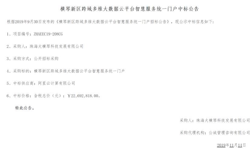 速途網11月20日消息(報道:李楠)近日,珠海產權交易中心網站公布信息顯示,阿里云中標橫琴新區(qū)跨域多維大數據云平臺智慧服務統(tǒng)一門戶,采購人為珠海大橫琴科技發(fā)展有限公司,項目金額為22,692,818.00元。此前,阿里云還中標了橫琴新區(qū)的跨域多維大數據云平臺基礎組件采購項目,項目金額為90,918,573.23元,兩項總計1.13億元。