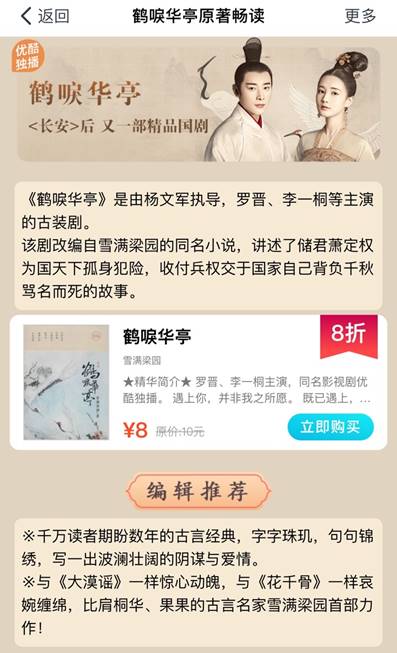 目前,書旗小說APP已經(jīng)上架《鶴唳華亭》的原著小說,還推出了8折看書的限時優(yōu)惠。有書旗網(wǎng)友表示,電視劇的更新有點慢,等不及要先看小說的大結局了。