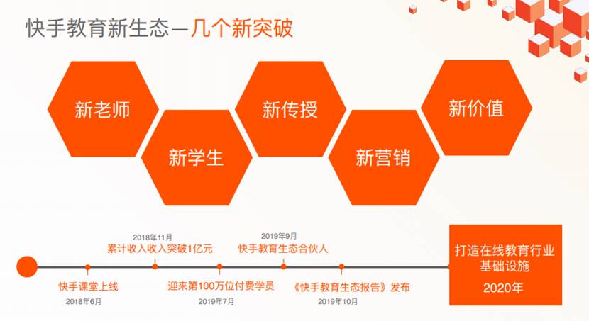 快手教育生態始于用戶間的自發互動,很多優秀的個人老師看到大家對學習的渴望,開始系統化地分享知識。快手做教育的最初動機就是幫助這些教育生產者變現,所以在2018年6月正式推出“快手課堂”的功能。