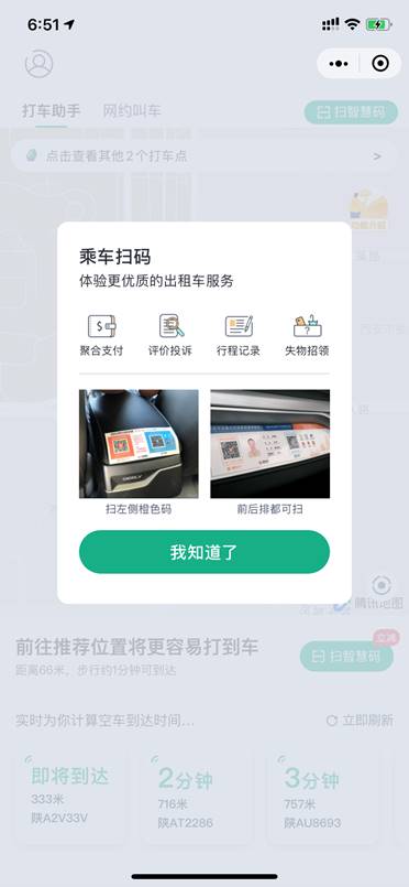 乘客通過打車助手乘車后,也可掃車上的「出租車智慧碼」享受網約化出行體驗。