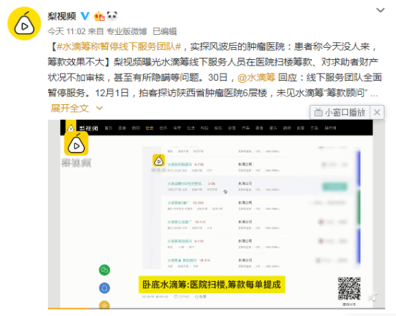 隨著梨視頻對于“掃樓”現象的公開,水滴籌迅速發文回應,稱將對部分地區個別線下人員的違規現象,在調查清楚后給以嚴懲,同時自即刻起,線下服務團隊全面暫停服務,整頓徹查類似違規行為。