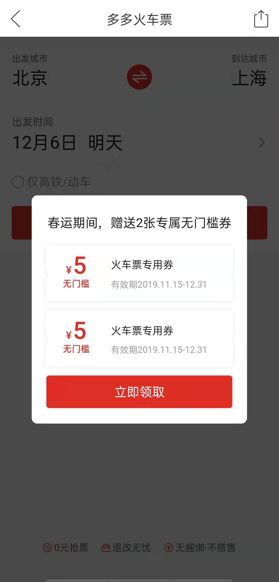 拼多多在App端和小程序上線火車票業務 周勇 ? 2019年12月5日 13:58 ? 快訊 速途網訊 近日,拼多多在App端和小程序上線了火車票業務。該入口位于拼多多首頁—充值中心—火車票,點擊進入后頁面顯示入口名為“多多火車票”。此外,拼多多還為新用戶贈送了兩張5元無門檻券。 拼多多 贊 (0) 周勇 0 生成海報 《人工智能中國專利技術分析報告》發布,百度5712件位列中國人工智能專利榜榜首 上一篇 2019年12月5日 13:57 OPPO宣布5G手機計劃,Reno3 Pro將率先搭載高通雙模SoC驍龍765G 下一篇 2019年12月5日 14:04