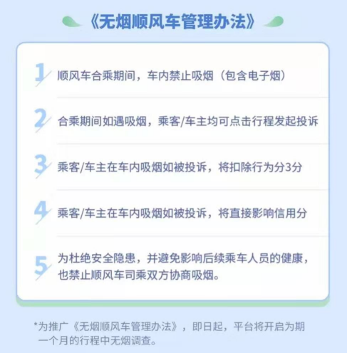 速途網訊 嘀嗒出行《無煙順風車管理辦法》已正式開始實施。嘀嗒出行方面稱,《無煙順風車管理辦法》從投訴機制,行為分扣除,影響信用和杜絕安全隱患等多個維度,來約束車主與乘客在合乘期間的吸煙行為。并將“在順風車合乘期間全面禁煙”的規范條例列入嘀嗒出行《順風車合乘公約2.0》。同時,《管理辦法》還指出,為杜絕安全隱患,并避免影響后續乘車人員的健康,也禁止順風車司乘雙方協商吸煙。