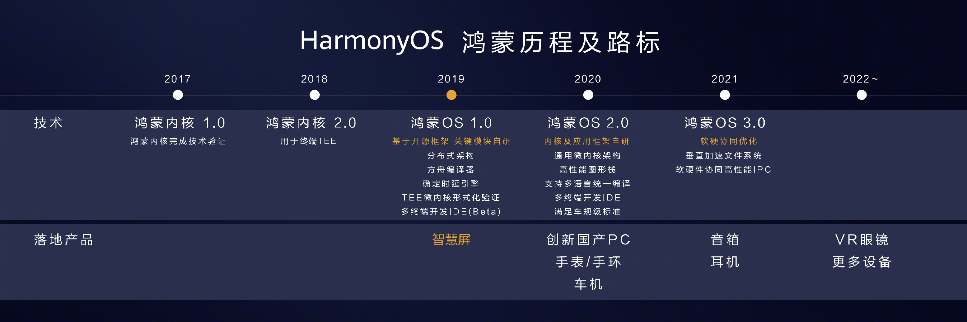 回顧今年8月9日,鴻蒙系統(HarmonyOS)在華為開發者大會HDC2019上首次面世,華為消費者BG CEO余承東同期公布了鴻蒙歷程及路標圖。圖中表示,今年的鴻蒙系統1.0將搭載于智慧屏產品中,明年鴻蒙系統將實現內核及應用框架自研,并將用到PC、手表、手環上。