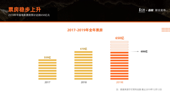 截至12月12日,2019年中國電影票房達到606億元,已經接近2018年全年票房,保持了穩步上升的態勢。在13日發布的報告中,燈塔更是預測2019年的全年票房將最終達到650億元。此外報告顯示,2019年中國電影市場保持了一些良好的發展趨勢,如:觀影總人次進一步提升、票房向三四線城市繼續下沉,以及國產片持續發力,繼2018年后再次貢獻全年6成票房。