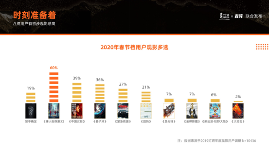 對于即將到來的2020年春節檔,燈塔報告也做出了前瞻。數據顯示,2019年春節檔和國慶檔購票用戶重合度不足四分之一,市場潛力巨大。在2020年,這個《中國女排》、《唐人街探案3》、《姜子牙》等影片云集的春節檔熱度空前高漲,以映前50天作為觀察結點,用戶“想看”熱度從2019年的40.3萬上漲至327.9萬,大幅提升了714%。而根據統計,《中國女排》、《唐探3》成為了大部分用戶的觀影首選。