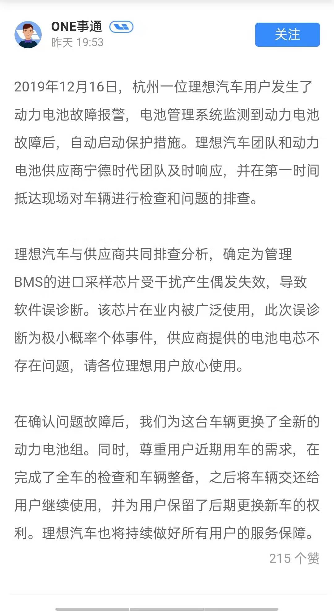 速途網訊 昨日,理想汽車官方賬號“ONE事通”發文稱,12月16日,有用戶發生了動力電池故障報警,電池管理系統監測到動力電池故障后,自動啟動保護措施。經排查分析后,確定為管理BMS的進口采樣芯片受干擾產生偶發失效,導致軟件誤診斷,為極小概率個體事件,供應商提供的電池電芯不存在問題。目前,已為這臺車輛更換全新的動力電池組,并為用戶保留了后期更換新車的權利。
