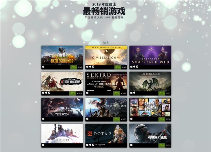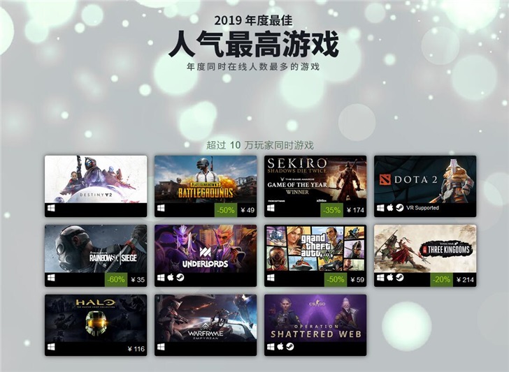 速途網(wǎng)訊 據(jù)Steam游戲平臺(tái)消息,目前官方已經(jīng)公布了2019年最暢銷游戲、最熱新品、最暢銷VR游戲、人氣最高游戲等排行。同時(shí)進(jìn)入暢銷榜鉑金級(jí)別和超過10萬玩家同時(shí)在線的游戲分別是:《絕地求生》、《命運(yùn)2》、《Dota 2》、《彩虹六號(hào):圍攻》、《全面戰(zhàn)爭:三國》、《只狼:影逝二度》、《GTA5》、《星際戰(zhàn)甲》和《反恐精英:全球攻勢》。