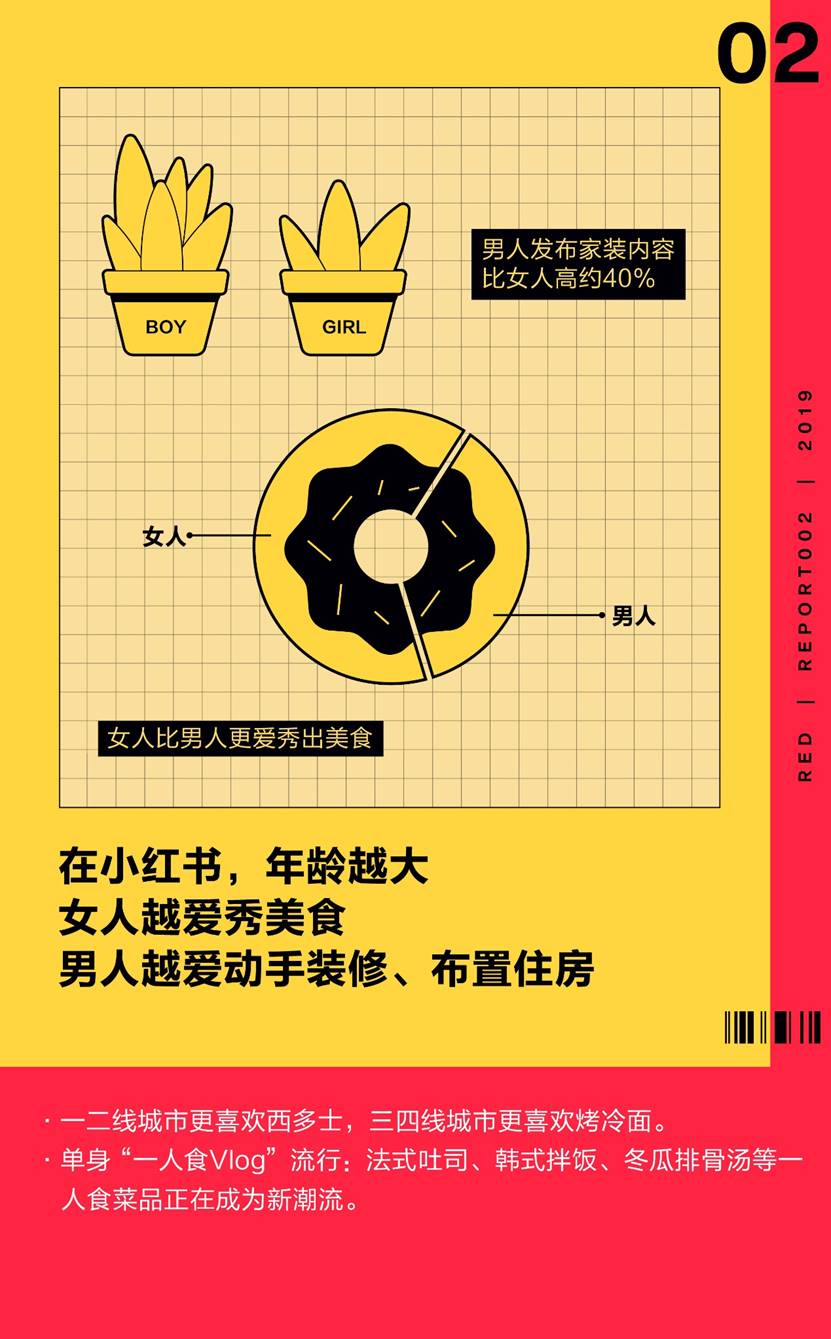 在家庭生活方面,小紅書已經成為眾多年輕人學習制作美食的平臺。報告顯示,在過去一年,年齡越大的群體,越愛發布美食內容。在性別方面,女性更愛發布美食內容。在飲食偏好方面,一二線城市人們更喜歡西多士,三四線城市的人們更喜歡烤冷面。