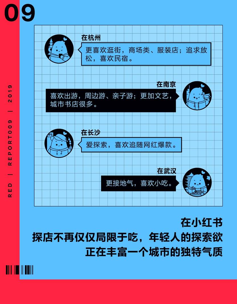 報告還顯示,在小紅書上成為潮流的“探店”形式正在發生一些改變,各個城市年輕人的探店愛好已經不再僅僅局限于美食。在杭州,創作者們更愛逛街打卡商場和服裝店,也愛追求放松,探尋一些民宿;在南京,創作者們喜歡周邊游,以及去城市書店;在長沙,小紅書創作者們追尋著網紅爆款打卡地;在武漢的創作者們,則在一遍遍地探尋這座城市最迷人的街邊小吃。