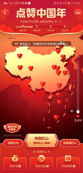 1月1日起,從快手APP的側邊欄進入快手春節預熱場“點贊中國年”活動主頁面,全屏紅色調把大家提前拽到春節氛圍里。中國地圖上持續閃爍著紅心,每一顆新增紅心,都是來自用戶的點贊,而紅心也成為打通多重玩法的關鍵。當快手平臺紅心數量達到“里程碑”時,所有用戶也都能領取到一定數量的紅心。收集紅心越多,參與活動次數越多,就有機會分到更多錢。