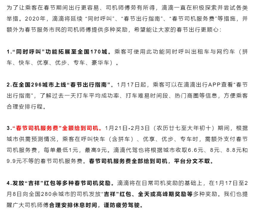 速途網訊 今日,滴滴表示,根據滴滴出行平臺數據預測,1月21日-2月3日(農歷廿七至正月初十),全國平均打車成功率將下降16%。其中,1月24日-1月26日、1月31日,將是打車最難的4天。滴滴稱,2020年將延續 “同時呼叫”、“春節出行指南”、“春節司機服務費”等措施,并額外為春節服務市民的司機師傅提供多種獎勵,其中包括“春節司機服務費”全額給到司機。