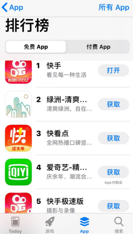 速途網1月14日消息(報道:吳佳馨)近日,有網友發現,蘋果官方應用商城App Store的“免費App排行榜”中,前5名的位置,有3個位置被快手和快手旗下APP占據。除了排名第一的主平臺“快手”,還有第三名“快看點”和第五名“快手極速版”。