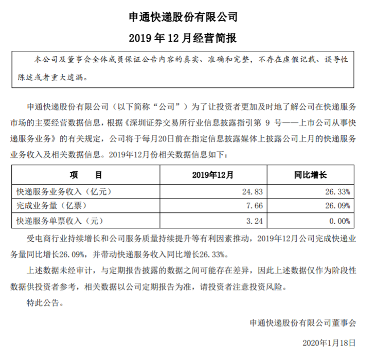 速途網(wǎng)訊 昨日,申通快遞發(fā)布了2019年12月經(jīng)營簡報(bào)。報(bào)告顯示,2019年12月實(shí)現(xiàn)快遞服務(wù)業(yè)務(wù)收入24.83億元,同比增長26.33%;完成業(yè)務(wù)量7.66億票,同比增長26.09%。